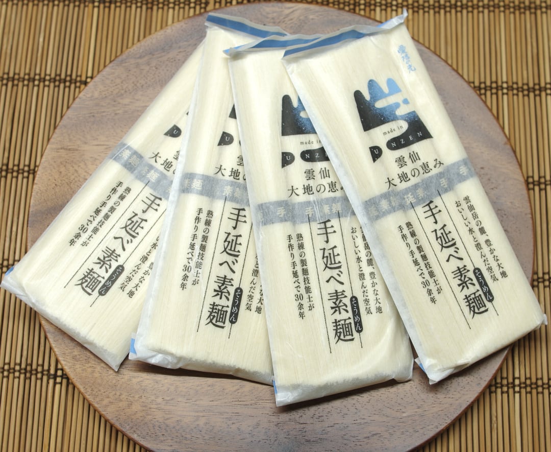 雲仙の豊かな自然の中、昔ながらの伝統の手延べと、熟成に時間をかけ丹念に仕上げました。